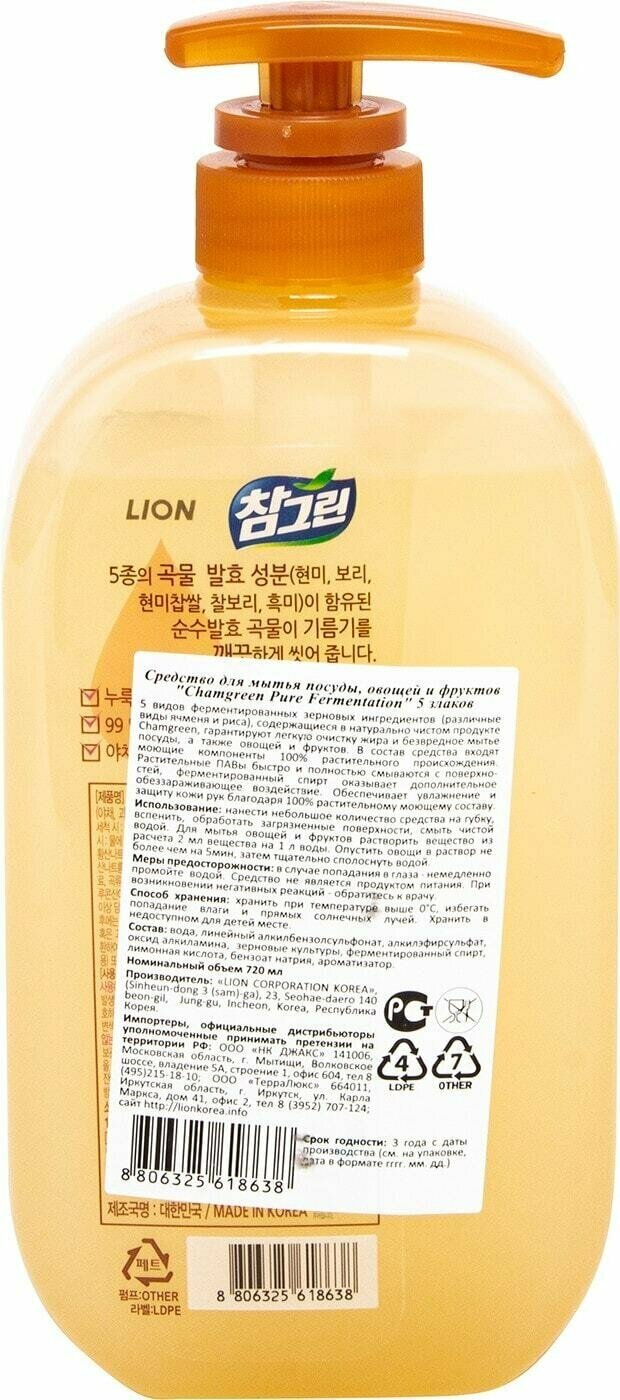 Средство для мытья посуды Lion Chamgreen Pure Fermentation 5 злаков, 720 мл