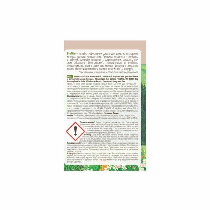 BioMio. BIO-COLOR Экологичный стиральный порошок для цветного белья с экстрактом хлопка БиоМио. Концентрат. Без запаха / BioMio. BIO-COLOR Eco Laundry Powder Color With Cotton Extract. Concentrate. Fragrance free