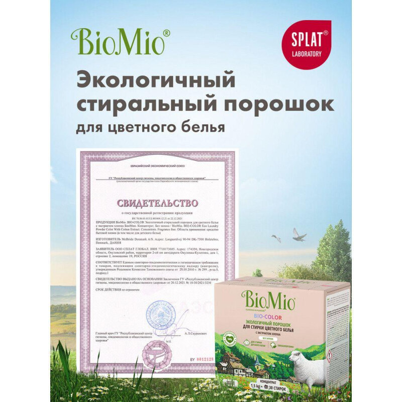 Стиральный порошок BioMio BIO-COLOR с экстрактом хлопка, для цветного белья, экологичный, 1,5 кг