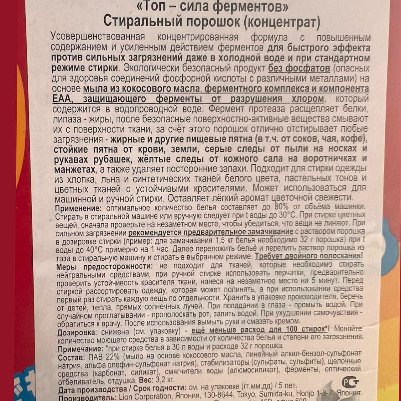 СохранитьПорошок стиральный универсальный Lion Япония TOP без фосфатов, 3,2 кг интересное: