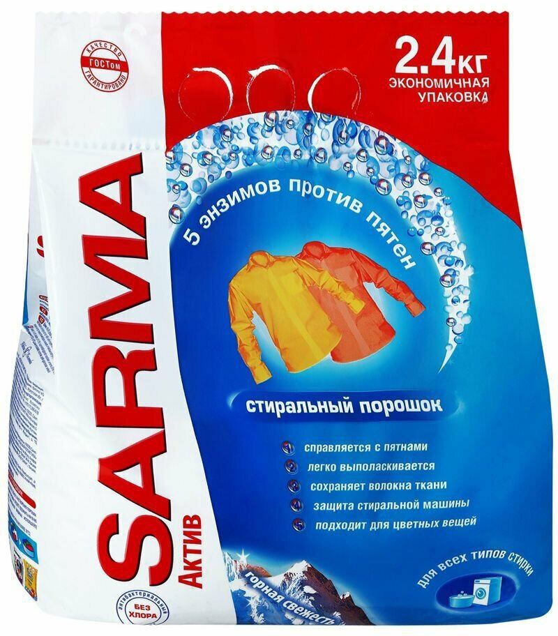 Купить Стиральный порошок Sarma Актив Горная свежесть с антибактериальным эффектом 2,4 кг.