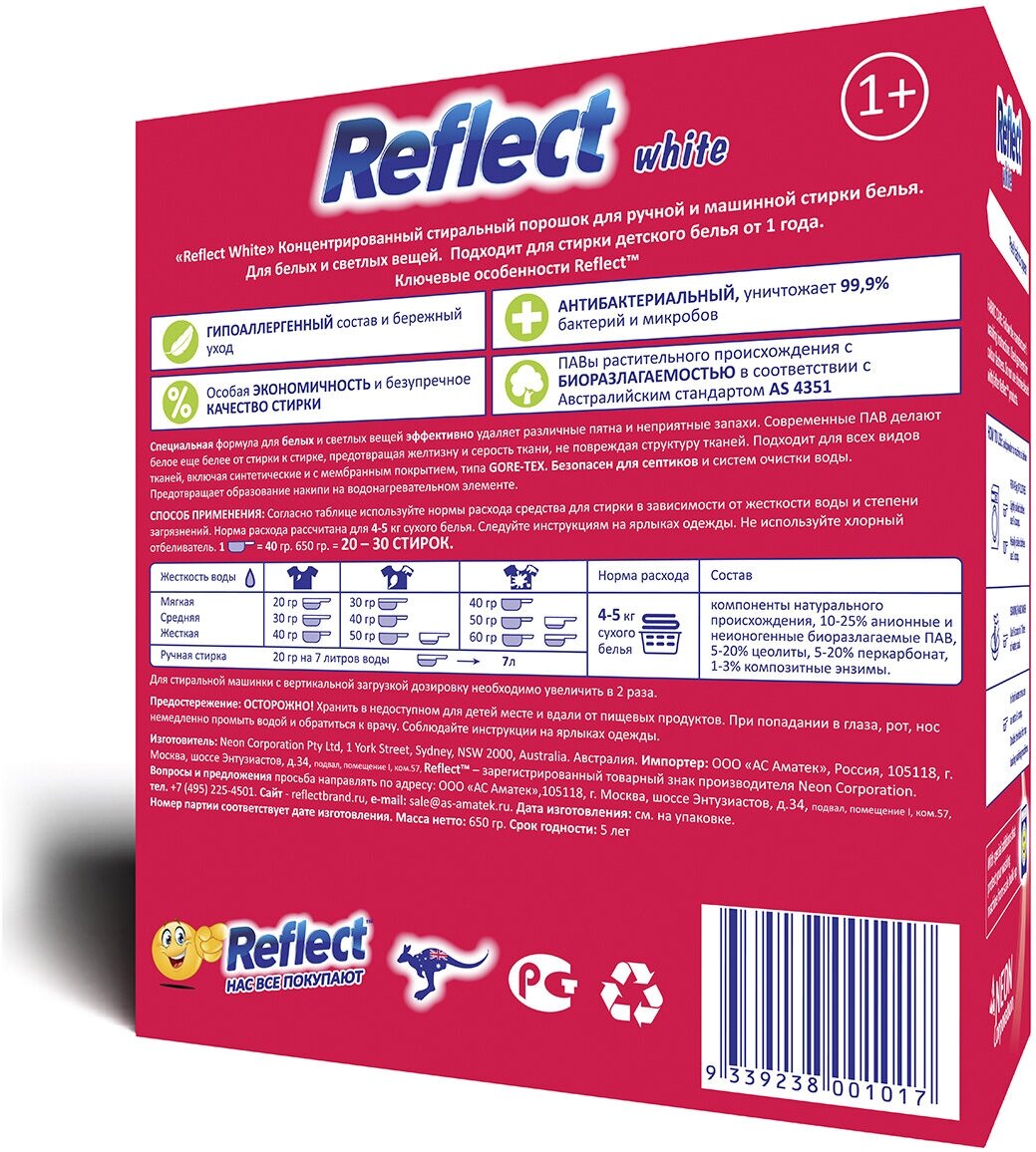Ниже Вы можете прочитать отзывы на Концентрированный стиральный порошок Reflect White, 650 гр, для всех видов тканей, восстановление белизны, для чувствительной кожи, ознакомится с подробными характеристиками, посмотреть интересные обзоры и фотографии на Концентрированный стиральный порошок Reflect White, 650 гр, для всех видов тканей, восстановление белизны, для чувствительной кожи.