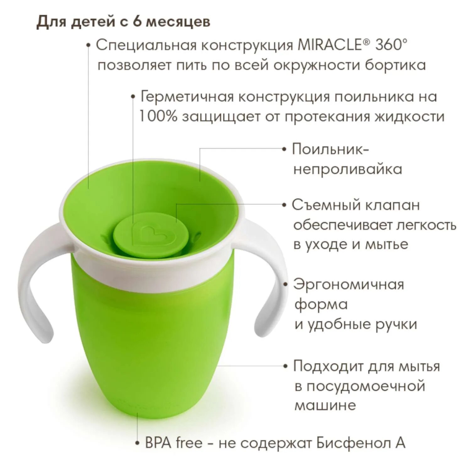 Герметичная конструкция Две ручки для удобства малышу Недостатки: Цена ни капли мимо! Герметичная конструкция поильника на 100% защищает от протекания жидкости специальная конструкция 360° позволяет пить по всей окружности бортика технология без горлышка лучше подходит для зубов малыша, а также позволяет быстрее ребенку приучиться к взрослым чашкам клапан, обеспечивающий полную защиту от разливания закрывается после питья съемный клапан для простоты питья не содержит бисфенол А |
