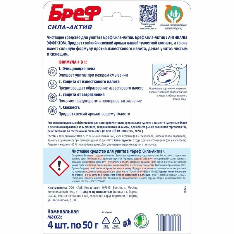Блок для унитаза Bref Сила Актив Лимон 4*50 г .