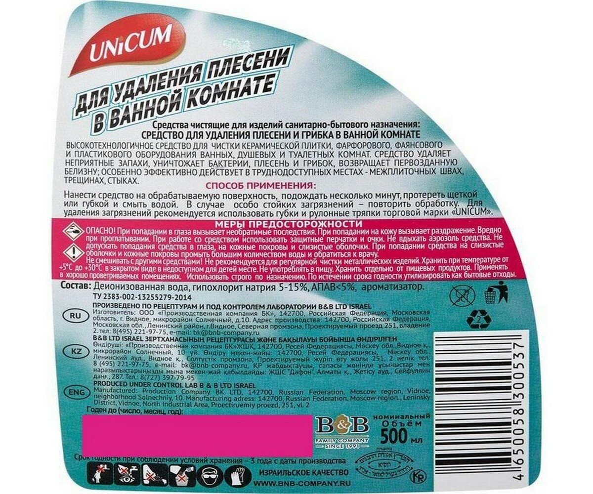 Чистящее средство 500мл UNICUM (Уникум), для удаления плесени в ванной комнате, спрей, ш/к 00537