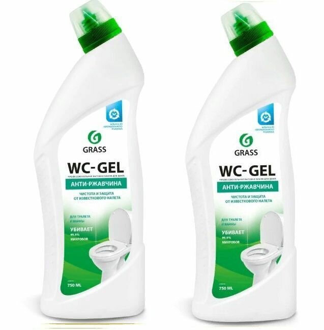 Grass Средство чистящее "WC-GEL" для чистки унитазов, кафеля, фаянса, Кислотное, 750 мл, 2 шт