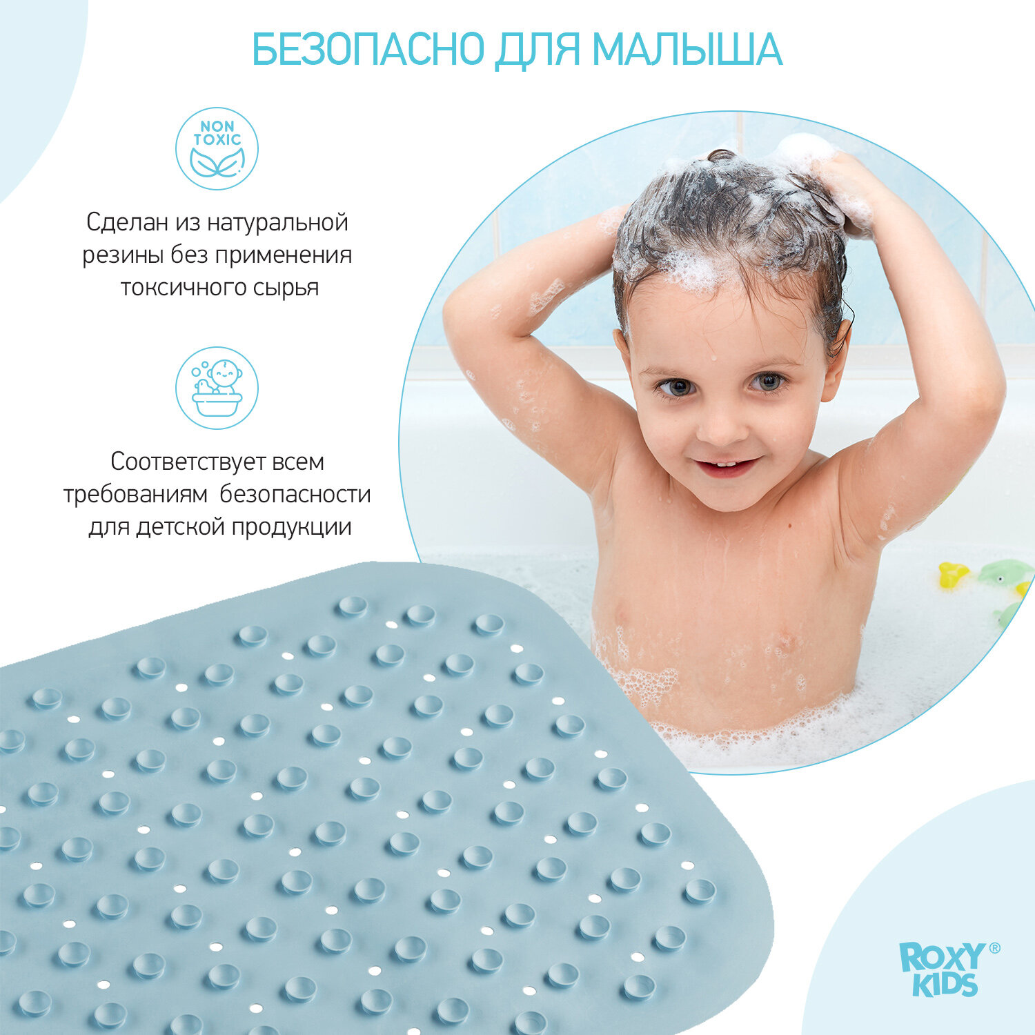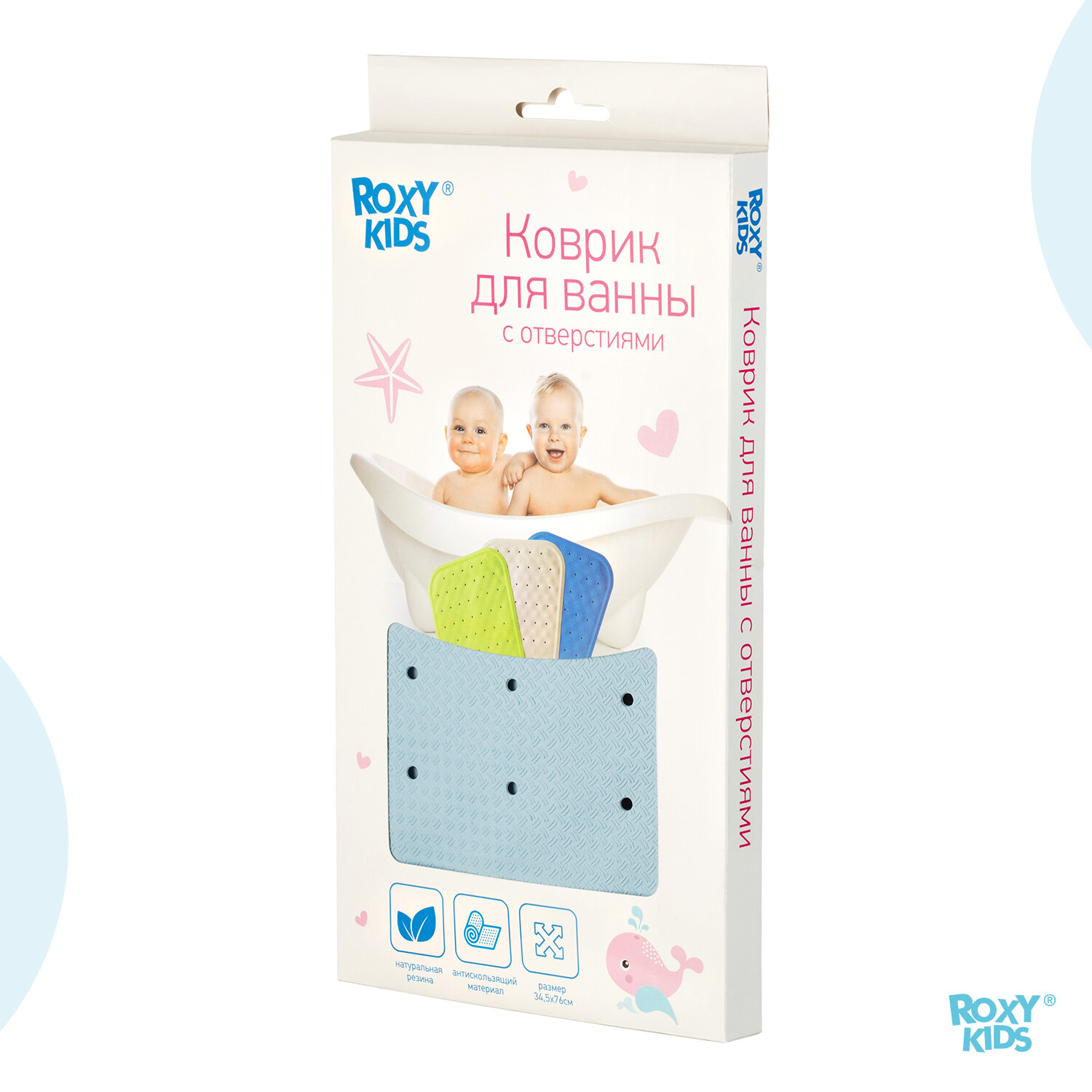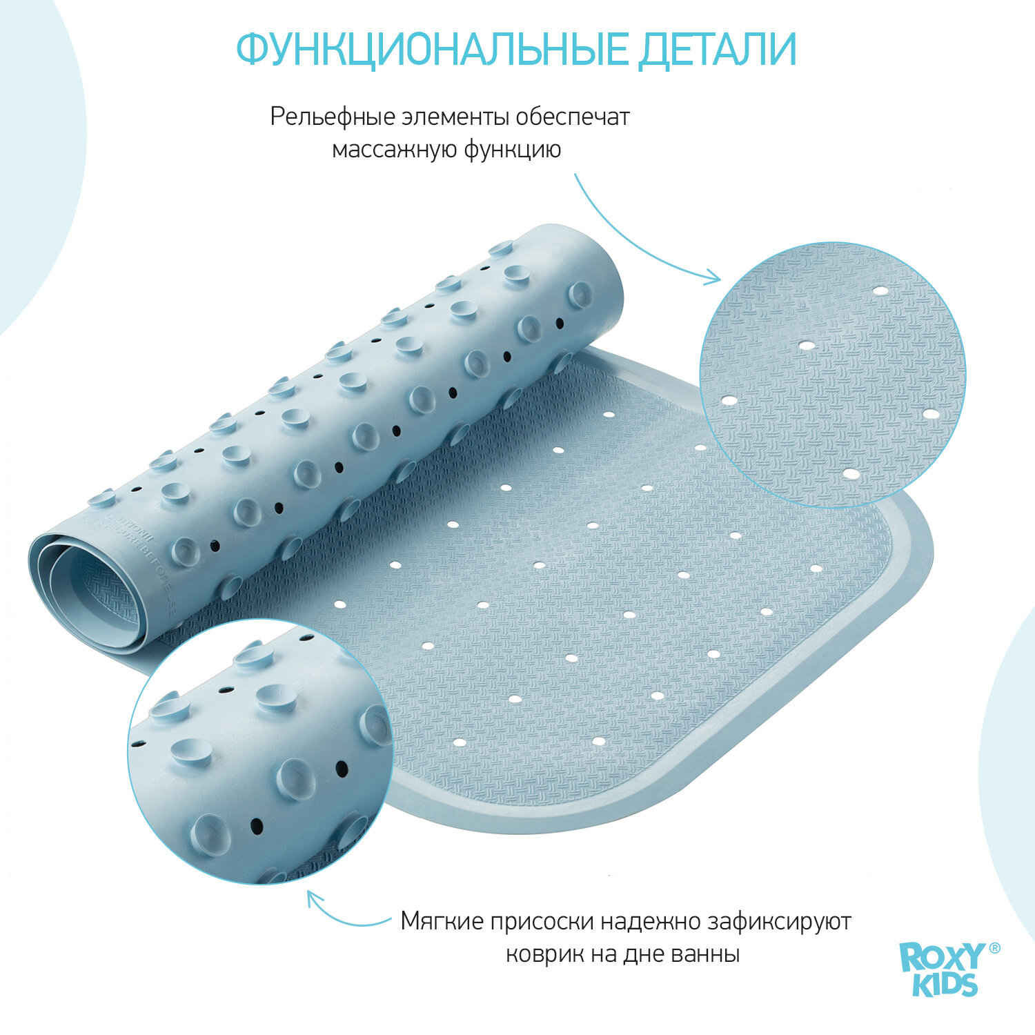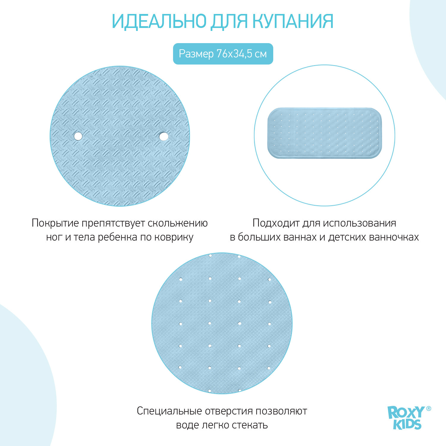 Коврик противоскользящий резиновый для ванной с отверстиями ROXY-KIDS 34,5х76 см, цвет голубой