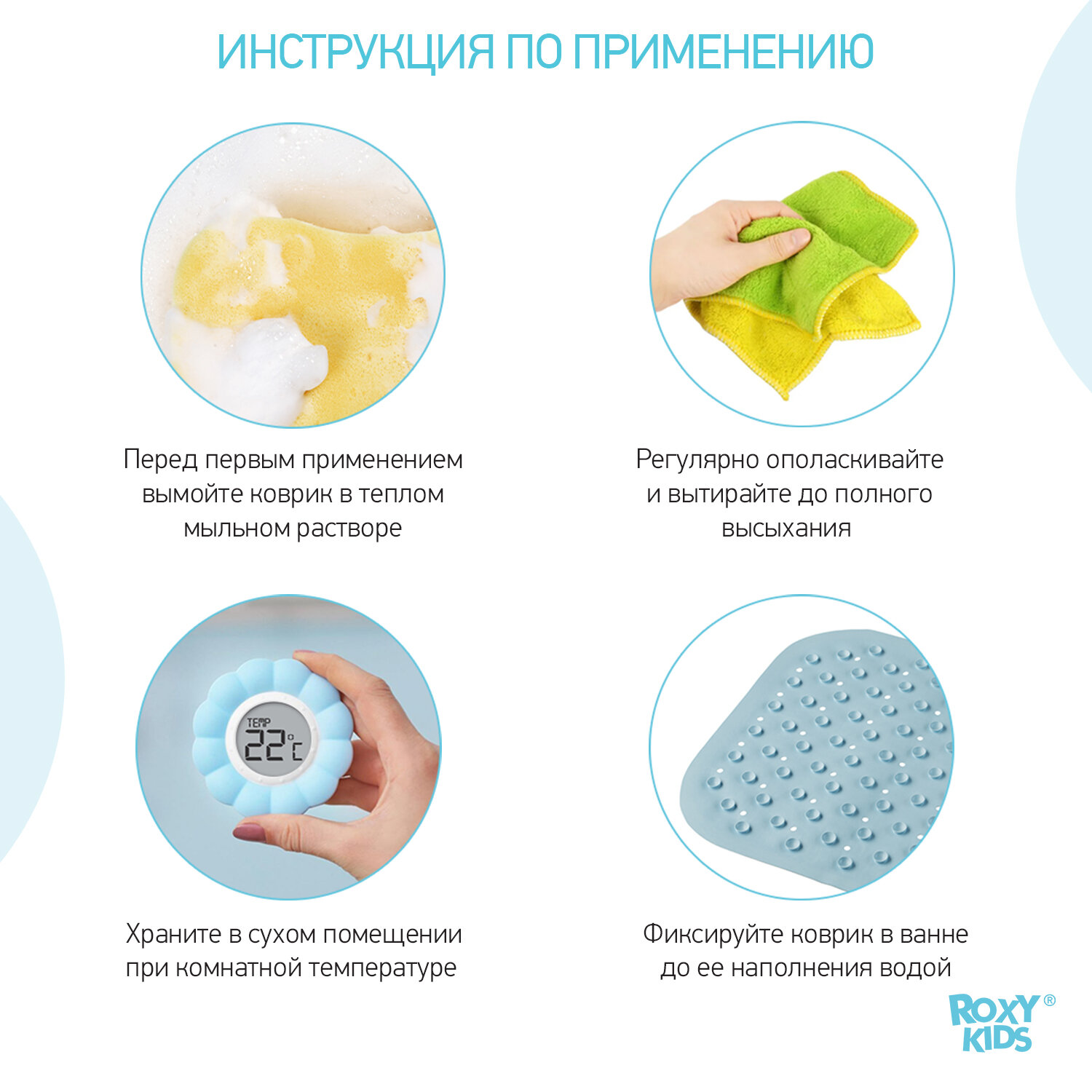 Антискользящий резиновый коврик для ванны ROXY-KIDS 34,5х76 см (с отверстиями) BM-34576-B голубой