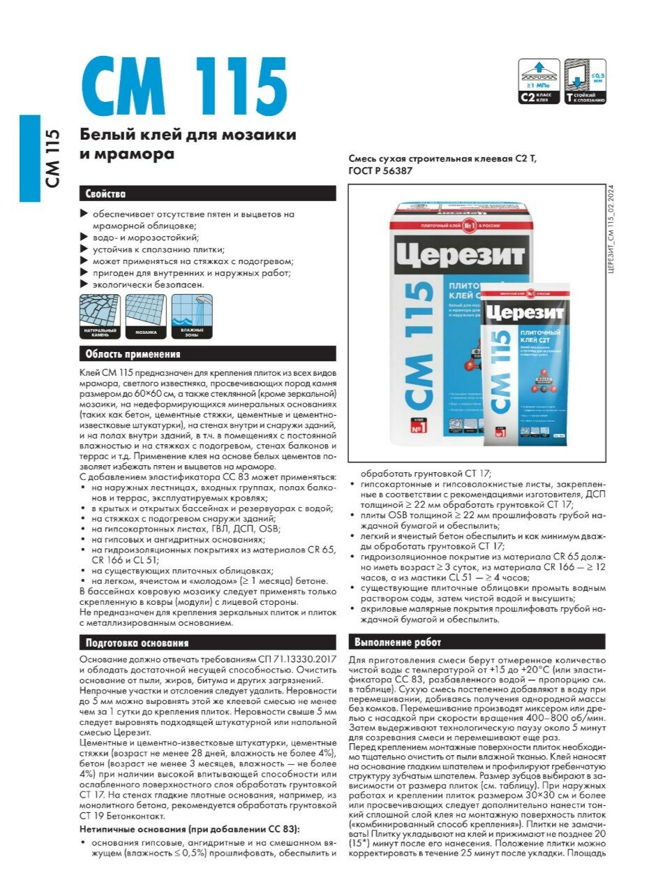 Ниже Вы можете прочитать отзывы на Клей для мозаики и мрамора Церезит CM 115 5 кг, ознакомится с подробными характеристиками, посмотреть интересные обзоры и фотографии на Клей для мозаики и мрамора Церезит CM 115 5 кг.