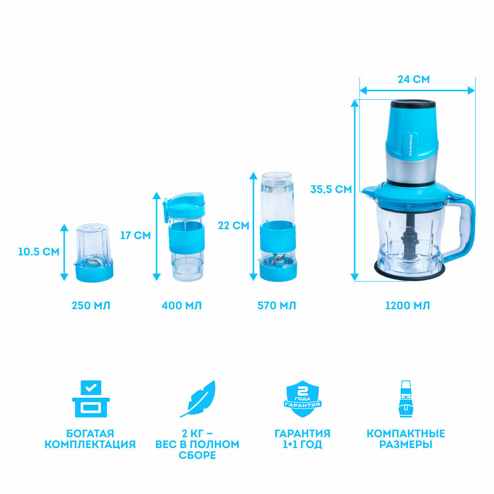 Погружной блендер 3 в 1, 2 скорости, мощность 800 Вт, небесно-голубой
