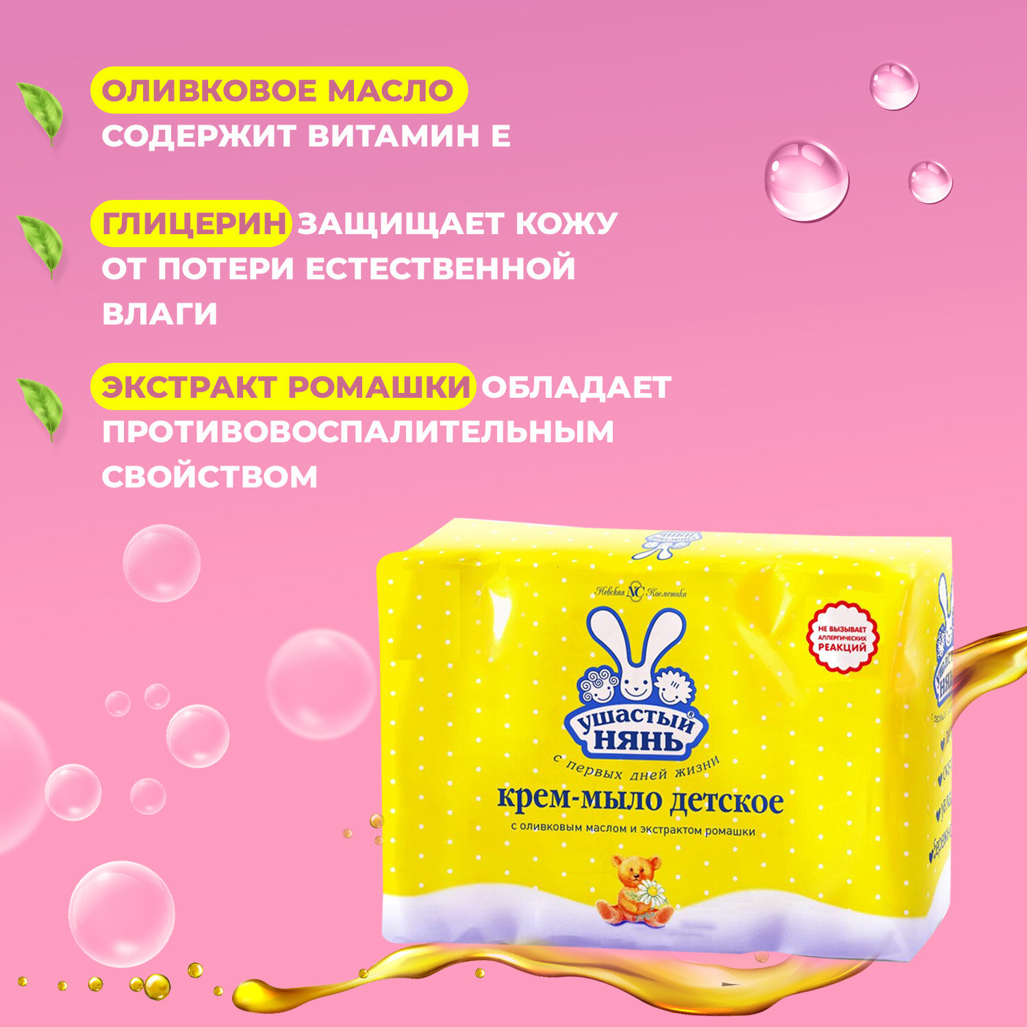 Детское крем-мыло Ушастый нянь, с оливковым маслом и ромашкой, 90 г