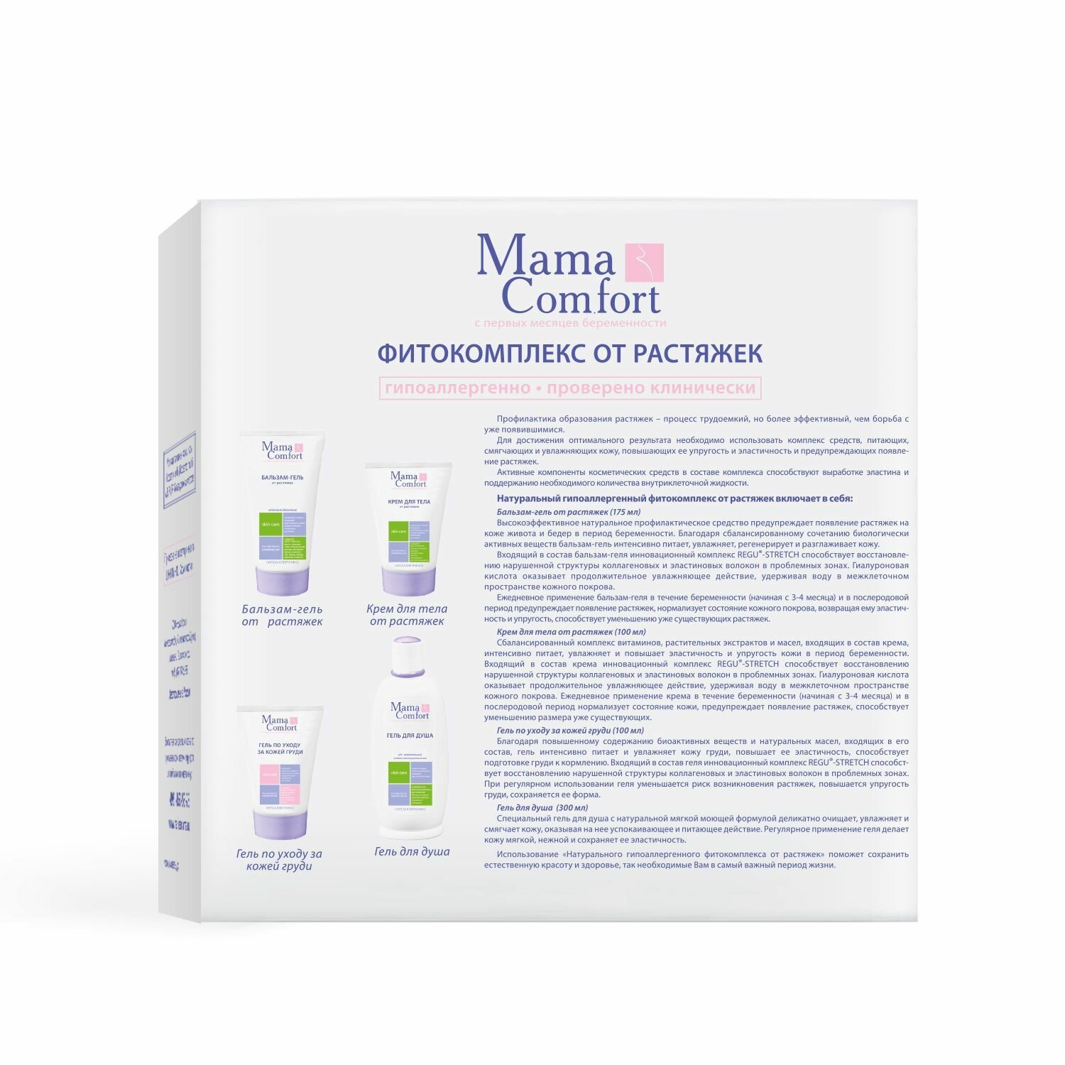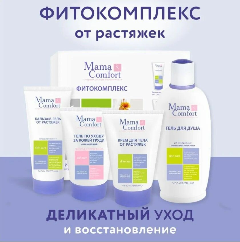 Фитокомплекс от растяжек Mama Com.fort, с гиалуроновой кислотой, бальзам-гель, крем для тела, гель для душа, гель по уходу за кожей груди