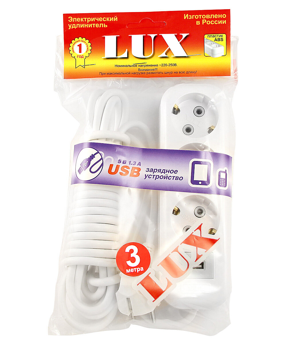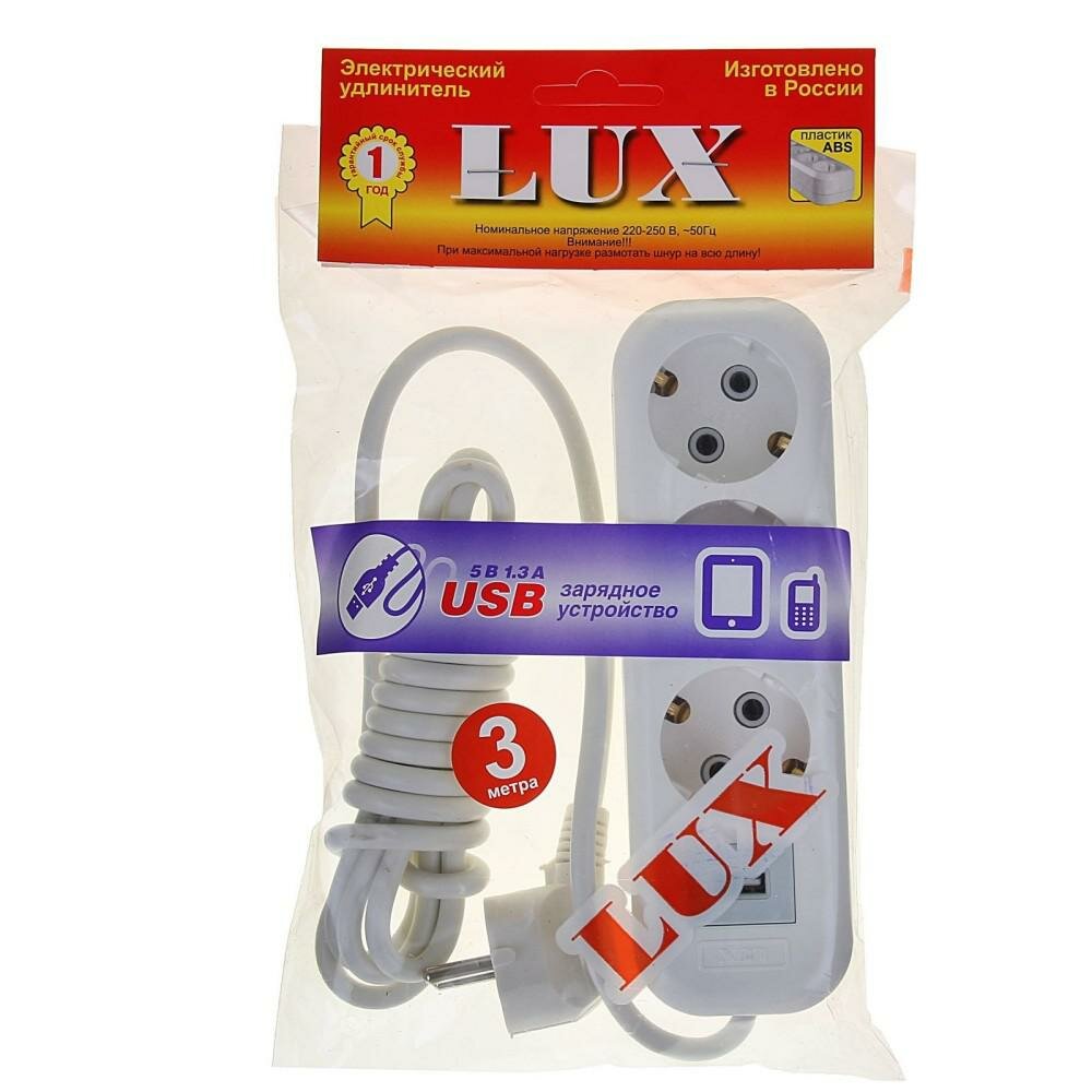 LUX У3-Е-USB-03 Удлинитель сетевой 3м 16А 3500Вт 3 гнезда + 1 USB с заземлением белый LUX