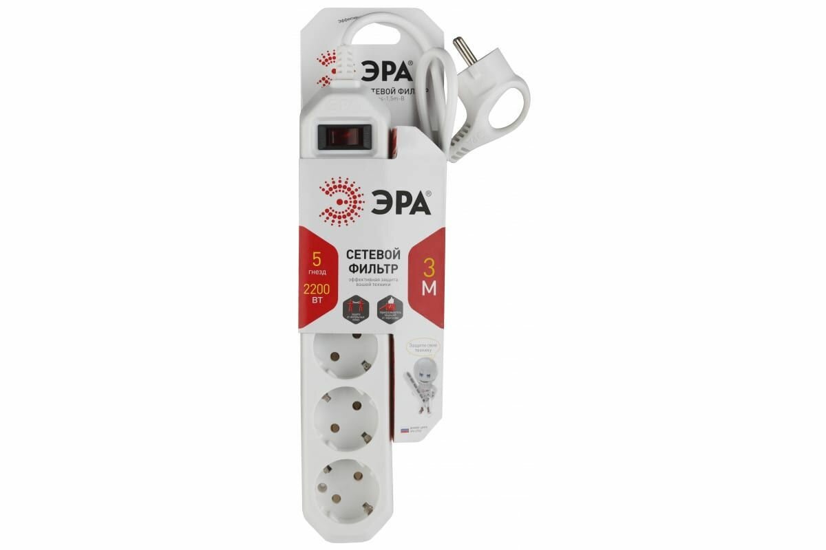 Сетевой фильтр ЭРА USF-5es-3m-W с базовой защитой с заземлением с выключателем 5 розеток 3м 10А белый