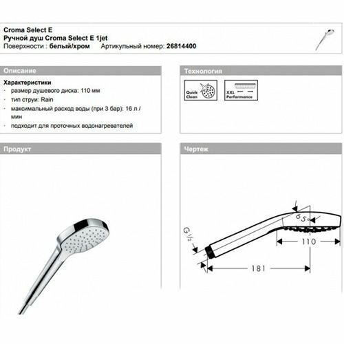 Душевая лейка Hansgrohe Croma Select E, арт. 26814400, 1 режим, хром / белый, без шланга, грязеулавливающий фильтр