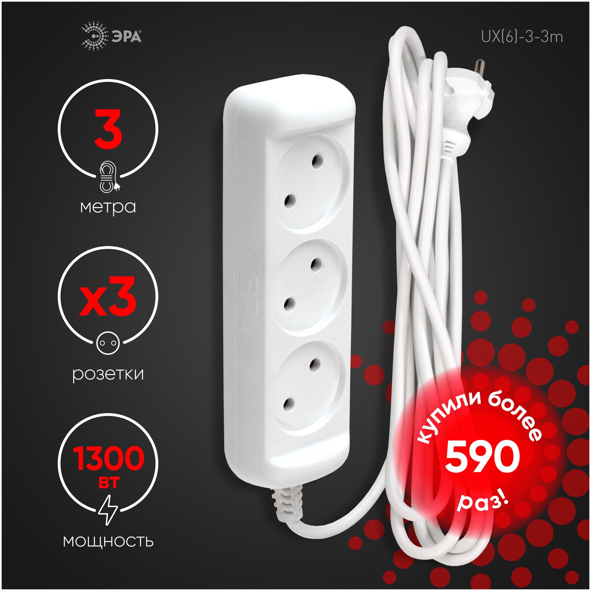 ЭРА UX(6)-3-3m Удлин-ль без зазeмл., 2х0.75мм2, ПВС, 3гн, 3м (5/20/720) интересное: