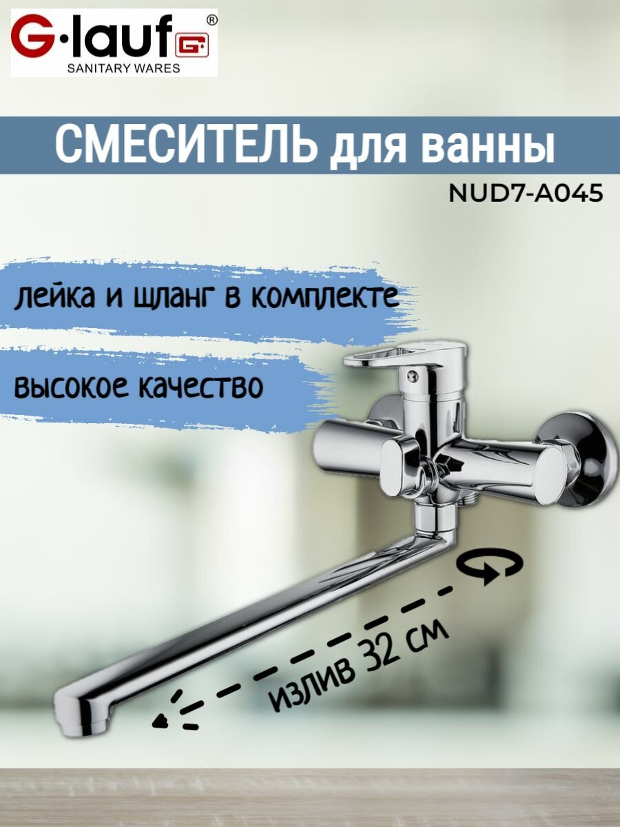 Смеситель для ванны с душем, лейкой, шлангом, кран в ванную G.lauf NUD7-A045, хром