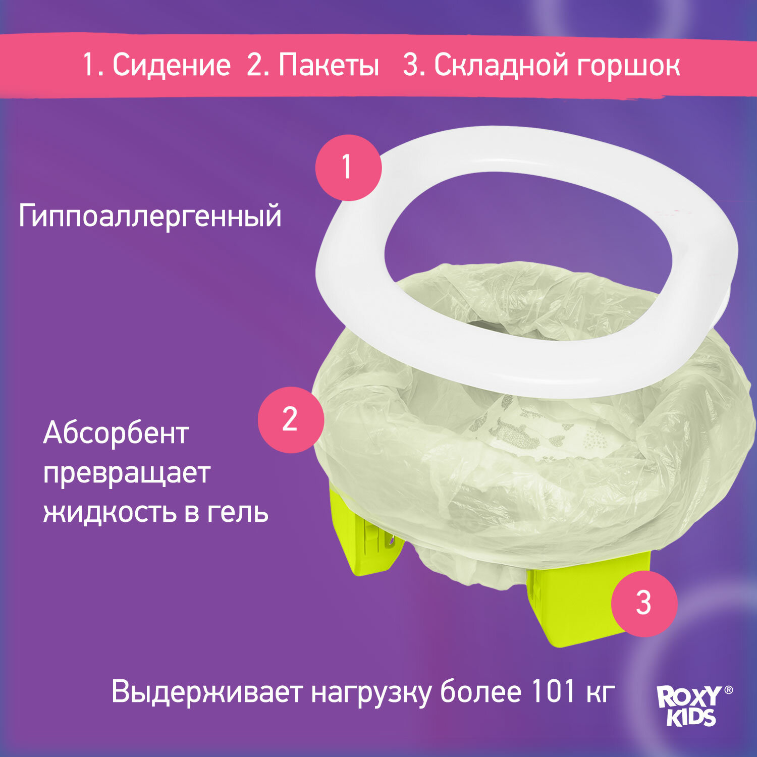 Горшок дорожный складной и насадка на унитаз HandyPotty от ROXY-KIDS с тремя пакетами, цвет фиолетовый