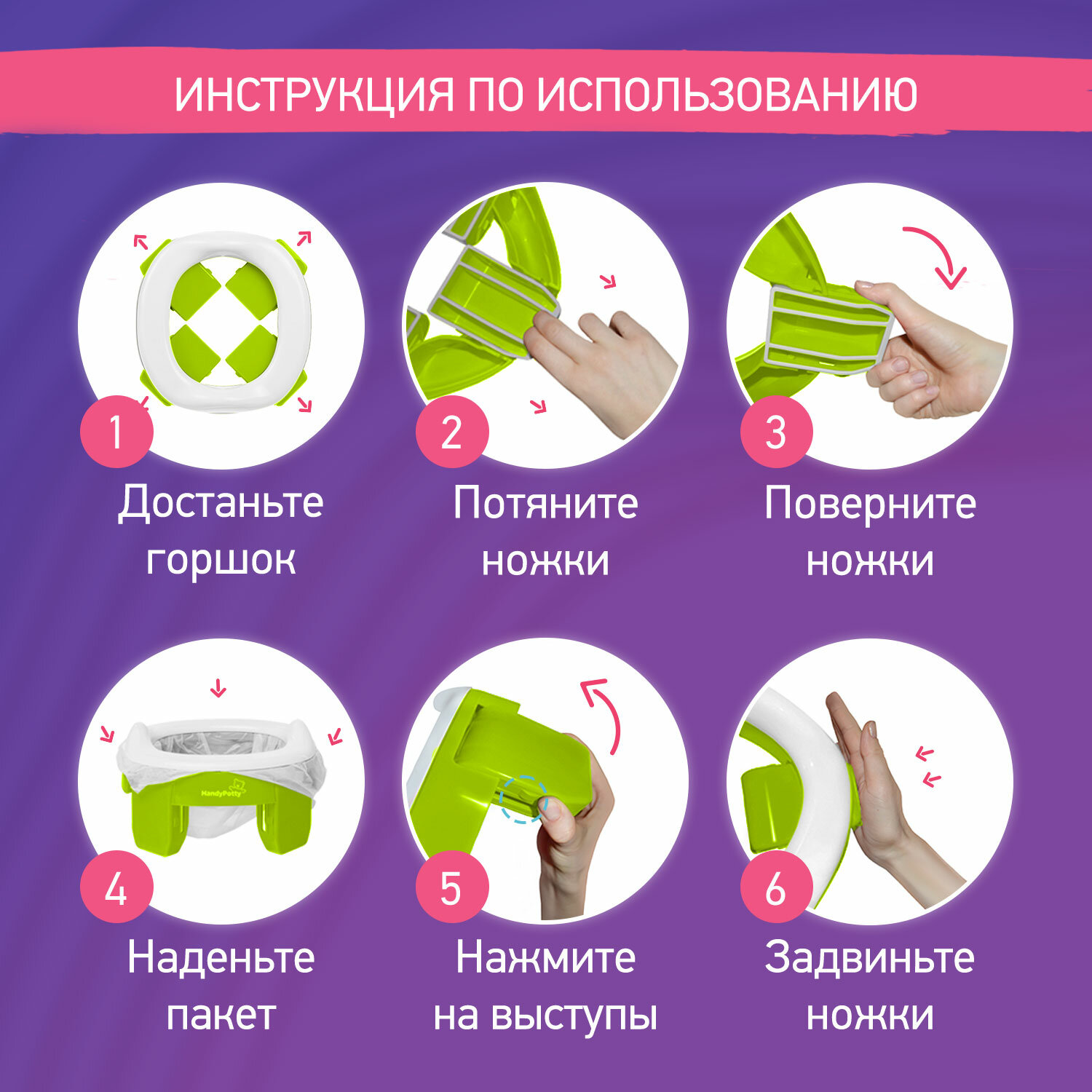 Горшок дорожный складной и насадка на унитаз Handy Potty от ROXY-KIDS с тремя пакетами, цвет фиолетовый