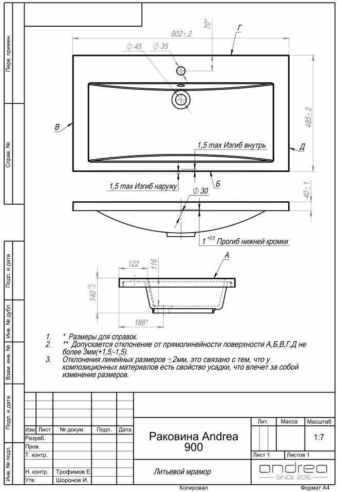 Умывальник "Andrea 90" (литьевой мрамор, 900х480х140) встраиваемый интересное: