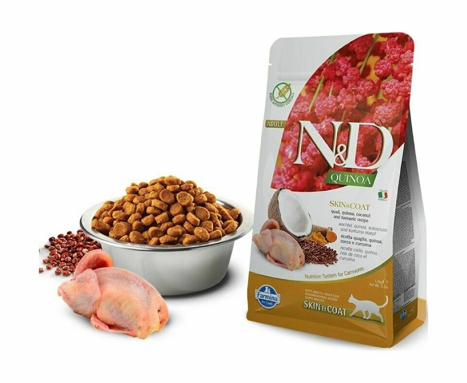 Сухой корм для взрослых кошек Farmina N&D Quinoa, беззерновой, для здоровья кожи и блеска шерсти, с перепелом, с киноа, с кокосом, с куркумой 1.5 кг