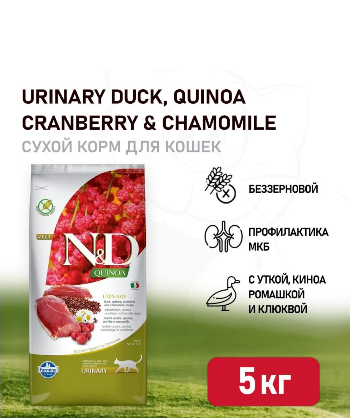 Сухой корм Farmina N&D Quinoa Urinary Duck Adult, для взрослых кошек, беззерновой, профилактика мочекаменной болезни (МКБ) , утка, киноа, клюква и ромашка, 5кг