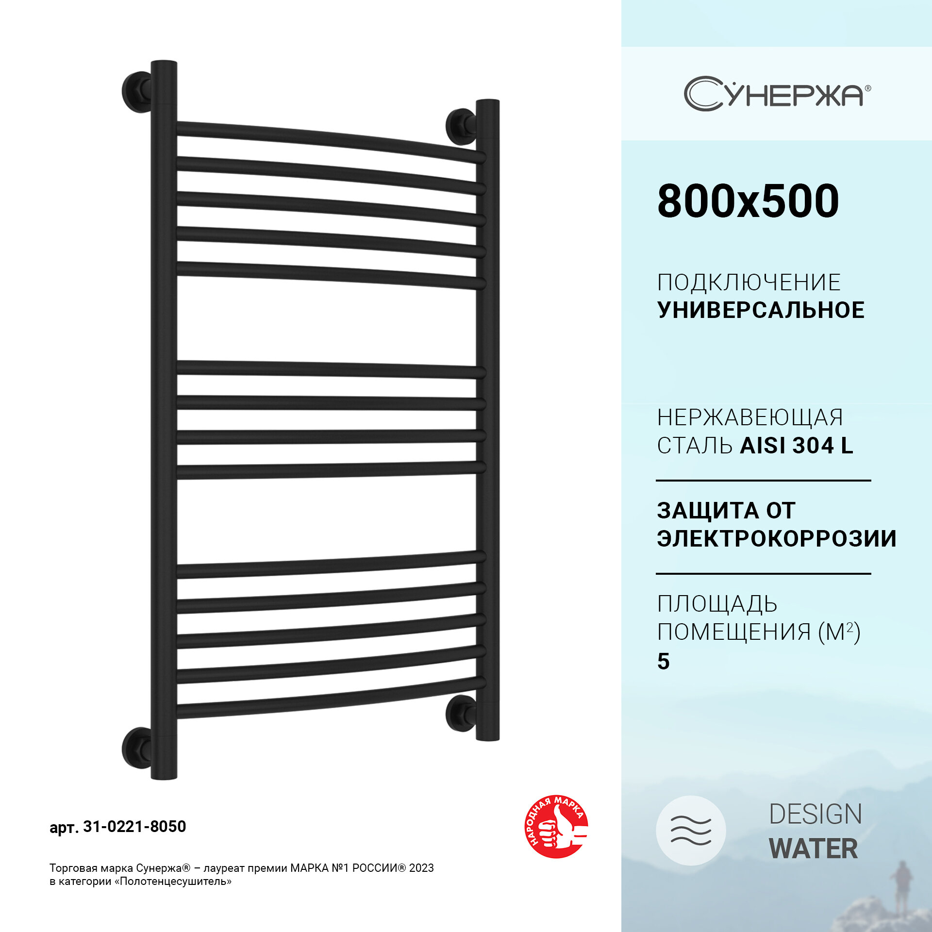 Водяной полотенцесушитель Сунержа Богема+ (выгнутая) 800x500 матовый черный арт. 31-0221-8050