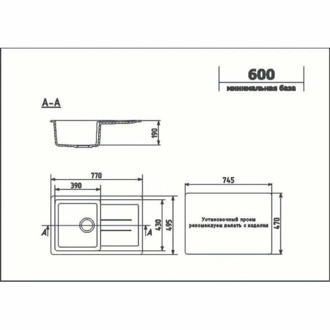 Мойка Ulgran, мрамор, U-507-308, (770*495*190 мм), черный, сифон и сливная арматура, в модуль 600