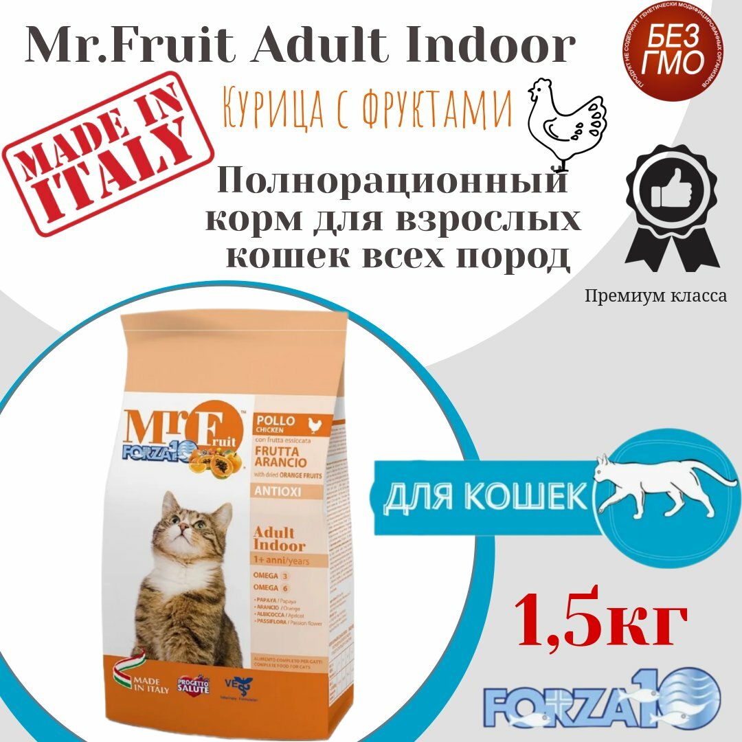 Сухой корм для кошек Forza10 Mr. Fruit Adult Indoor всех пород с экстрактом оранжевых фруктов /курица /1,5 кг