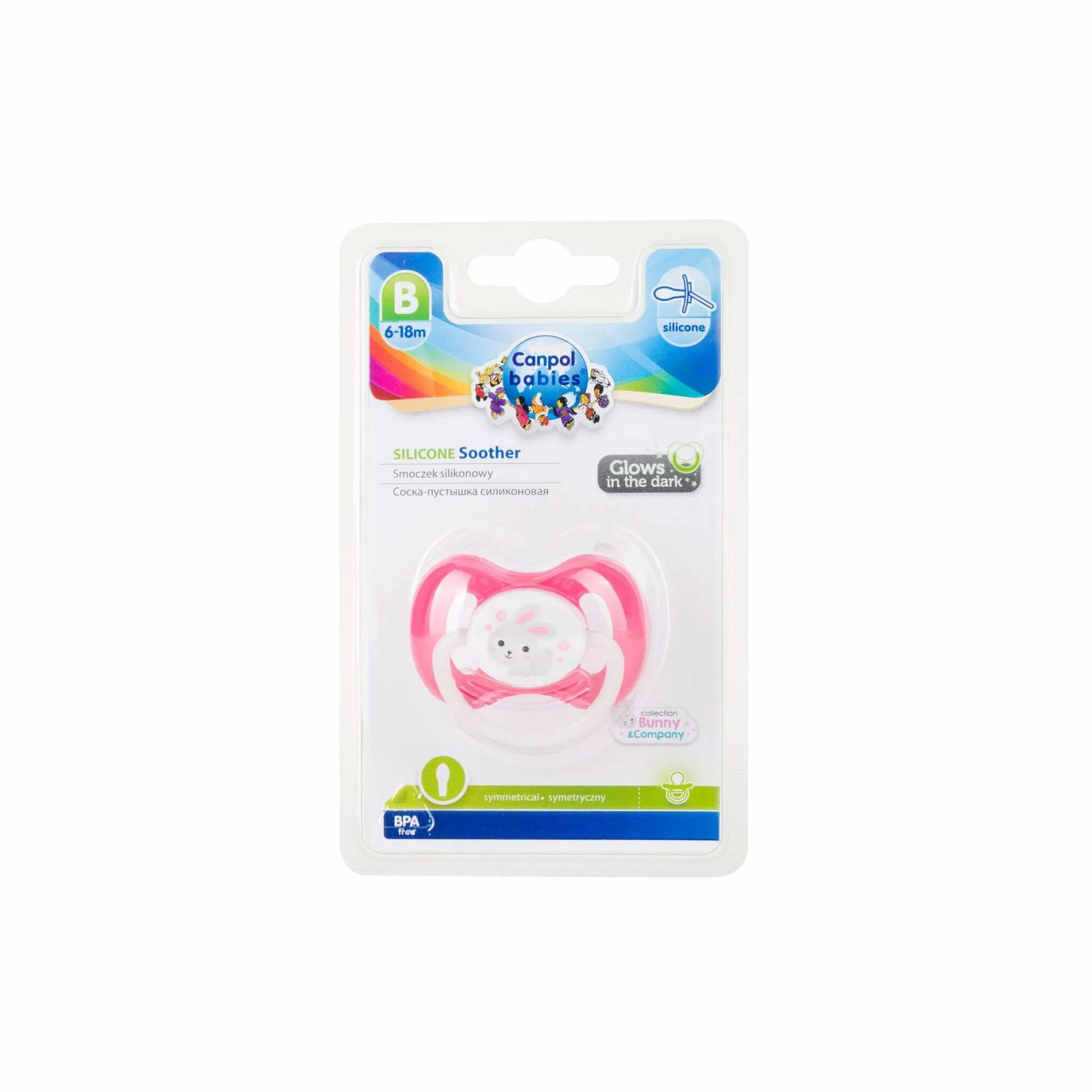Пустышка Canpol Babies симметричная силиконовая, 6-18 Bunny & company, цвет: розовый