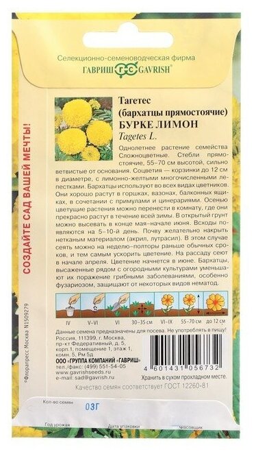 Семена цветов Бархатцы прямые (Тагетес) "Бурке Лимон", 0,3 г интересное:
