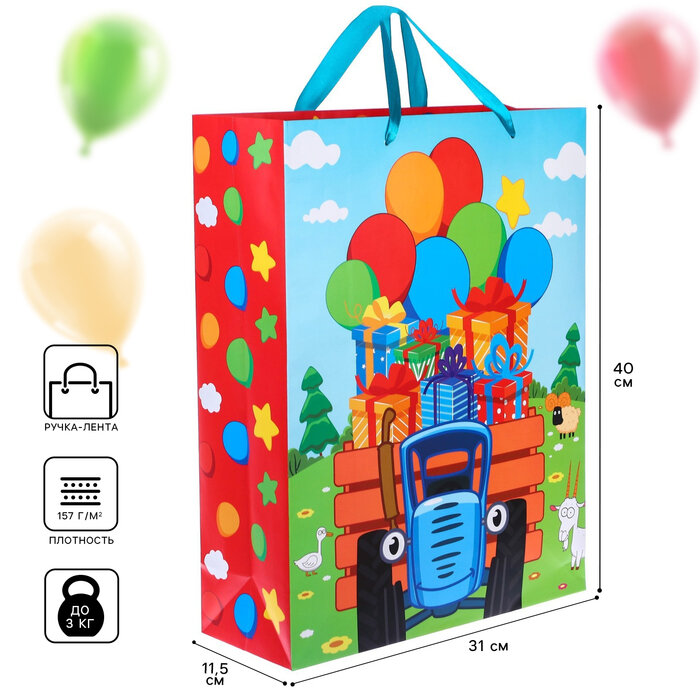 Пакет ламинированный вертикальный, 31 х 40 х 11,5 см "С Днем Рождения", Синий трактор интересное: