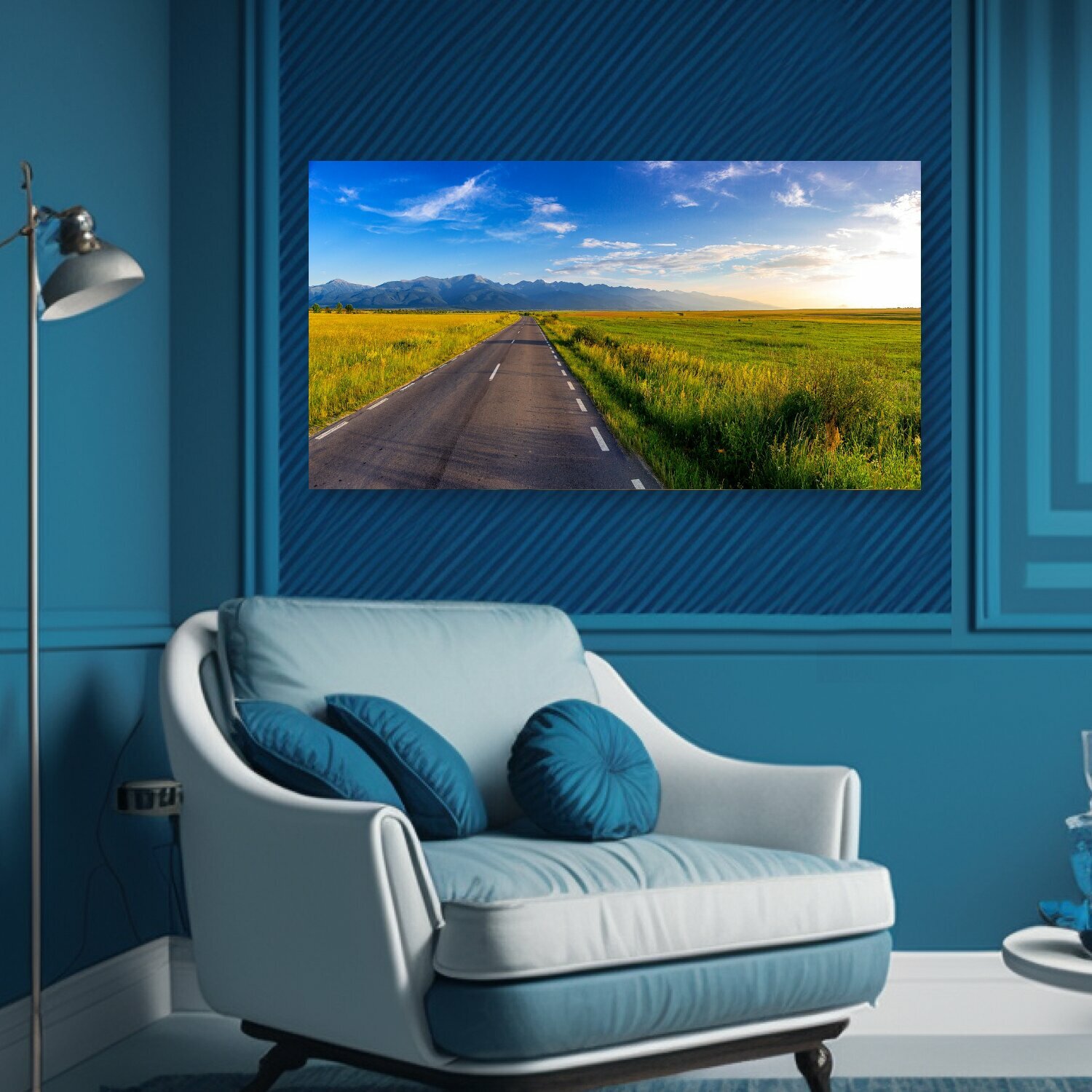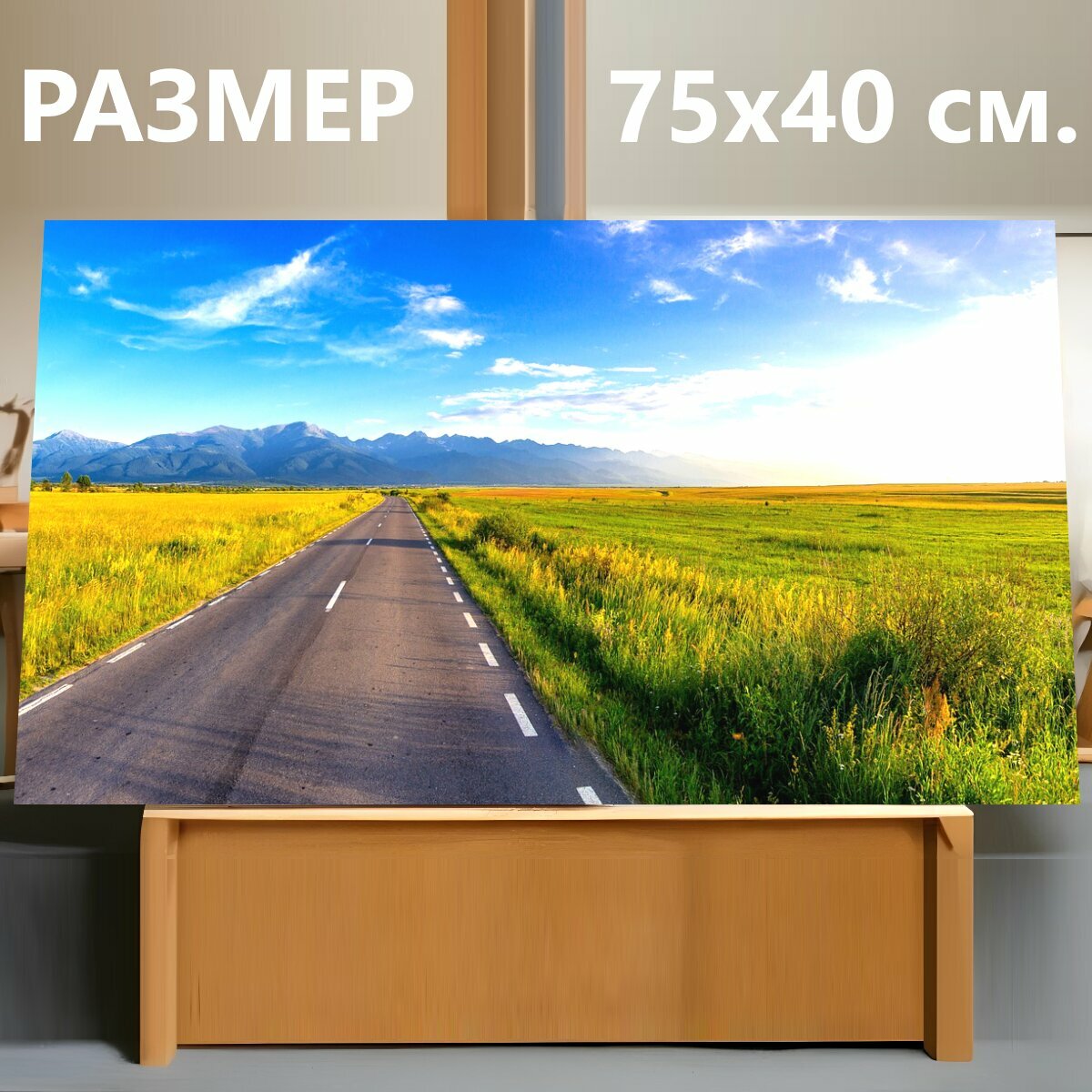Купить Картина на холсте "Дорога, горы, синее небо" на подрамнике 75х40 см. для интерьера