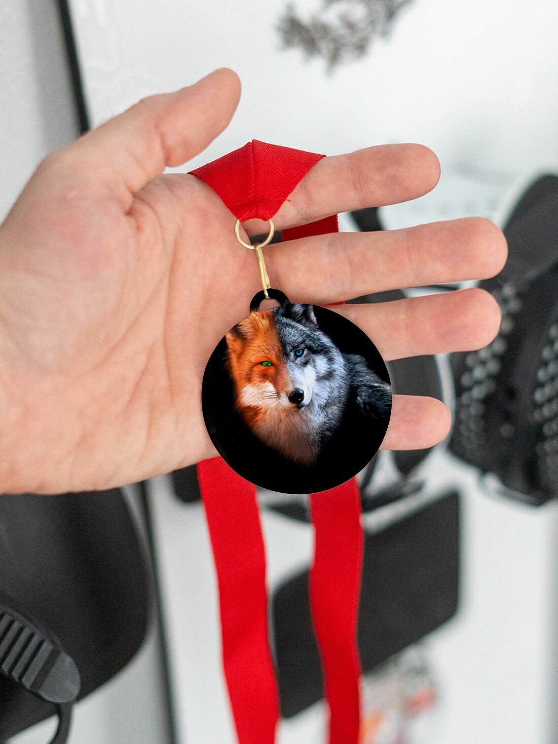 Медаль сувенирная спортивная подарочная Волк и Лиса, металлическая на красной ленте интересное: