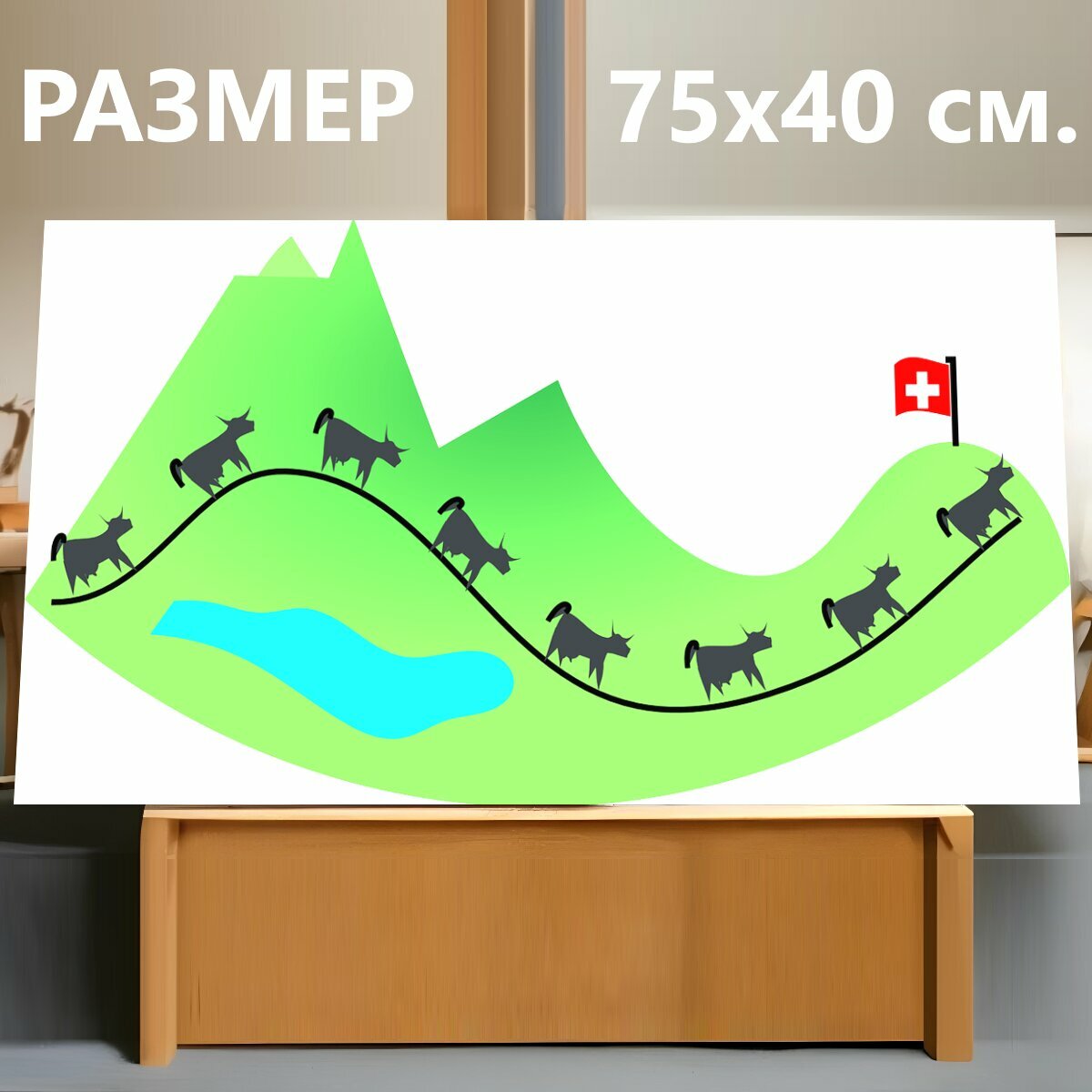 Картина на холсте "Холм, коровы, гора" на подрамнике 75х40 см. для интерьера интересное: