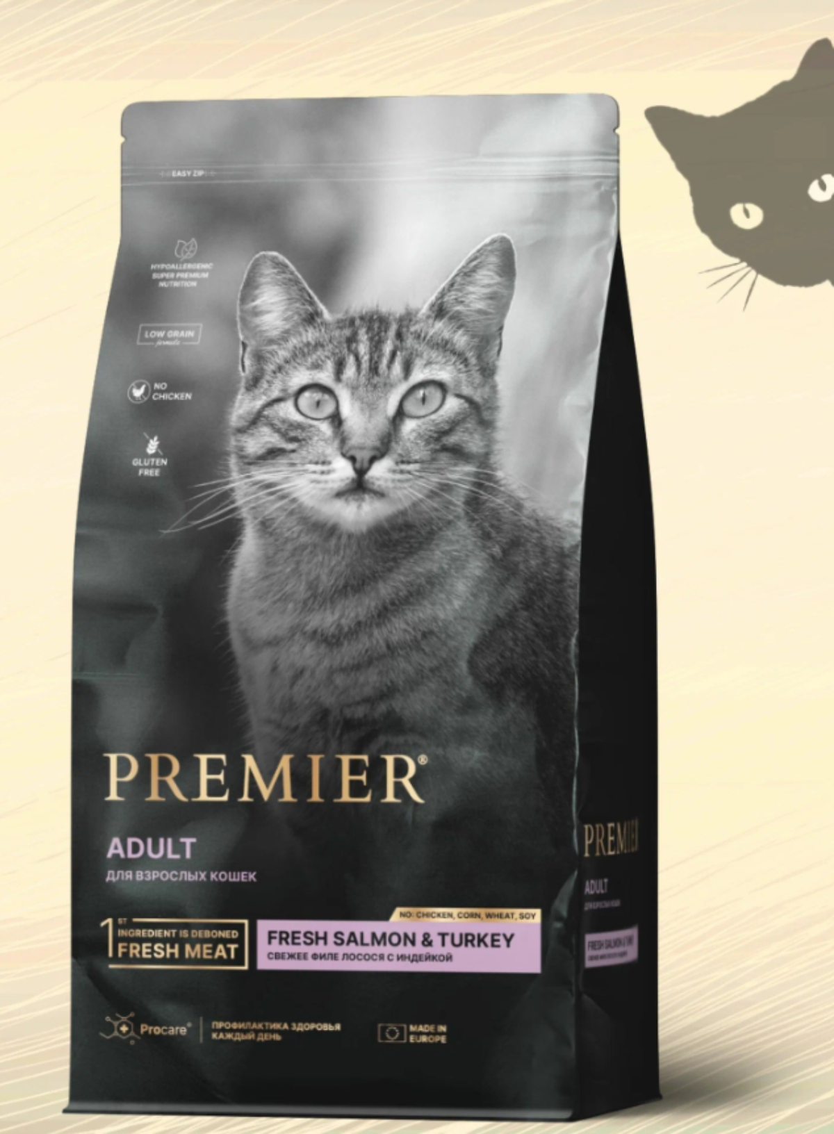 Купить Сухой корм Premier для взрослых кошек с нормальной активностью, чувствительным пищеварением или склонных к аллергии, с лососем и индейкой, 2кг