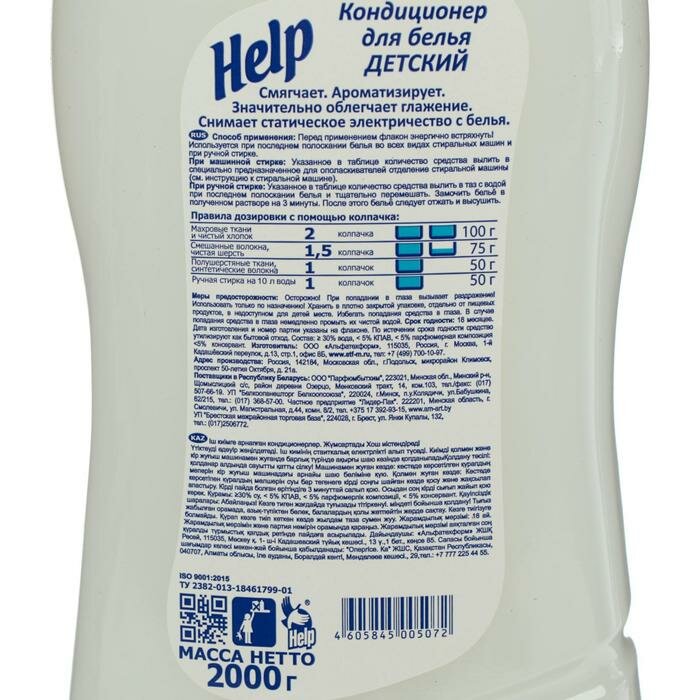 Кондиционер для детского белья Help 2 кг, в пластиковой бутылке, "Алоэ вера", для всех видов стиральных машин, для ручной стирки