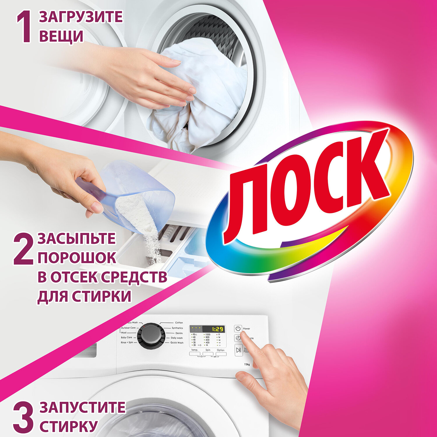 | Минусы: | Не отстирывает детские пятна от еды или светлые носки, даже при 60 градусах |