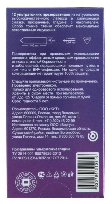 | Отзыв: | Хорошего качества, нет раздражения и ничего не натирает. Презервативы реально тонкие, ощущения в сексе не теряются, мне нравится марка, я советую. Смазка не маслянистая у них. |