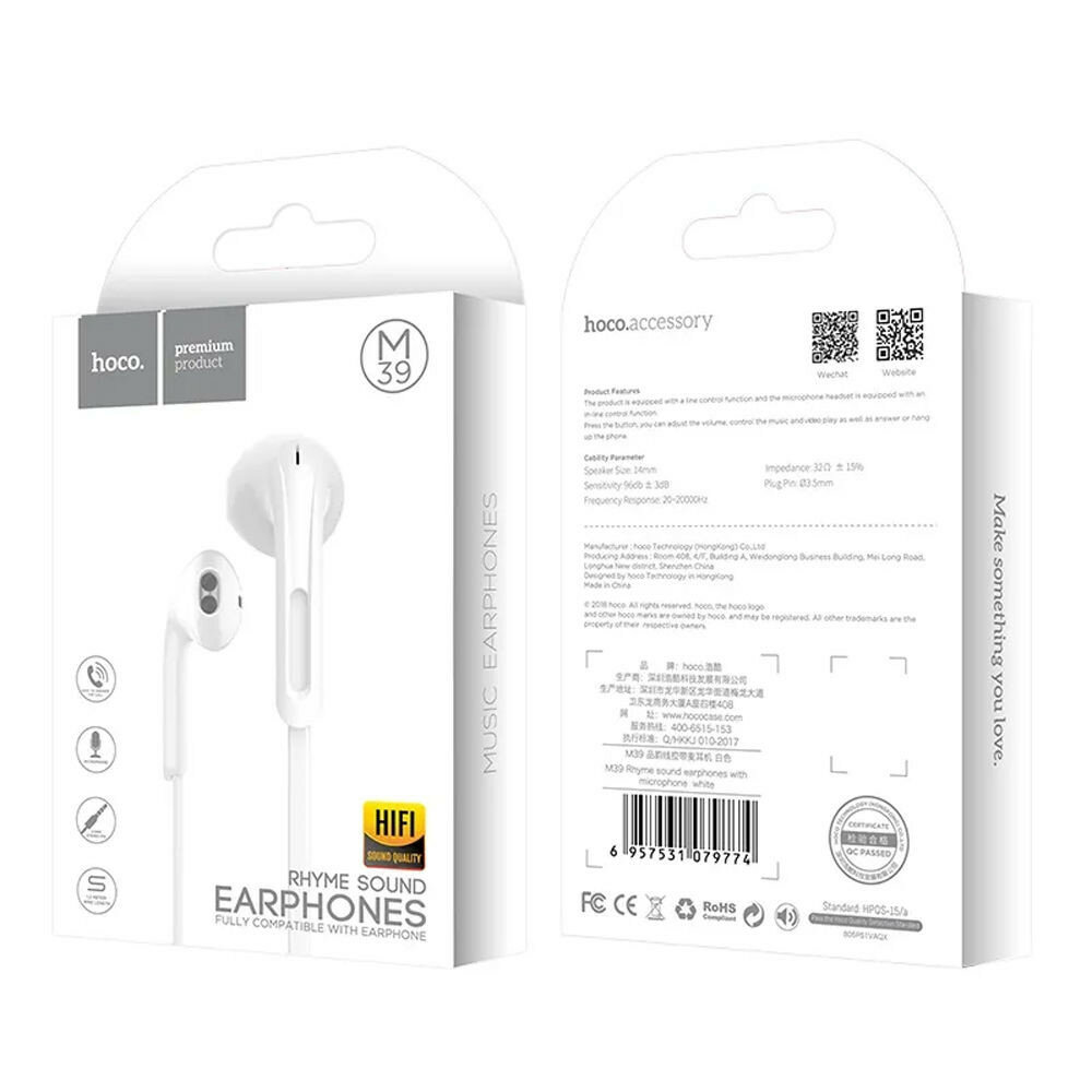 Проводные наушники вкладыши HOCO M39 Rhyme, AUX Jack 3.5mm, для телефона/компьютера, 1.2 м, белый