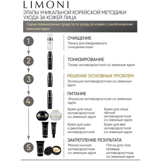 Ниже Вы можете прочитать отзывы на Антивозрастная эссенция для лица Limoni со змеиным ядом, 50 мл., ознакомится с подробными характеристиками, посмотреть интересные обзоры и фотографии на Антивозрастная эссенция для лица Limoni со змеиным ядом, 50 мл..