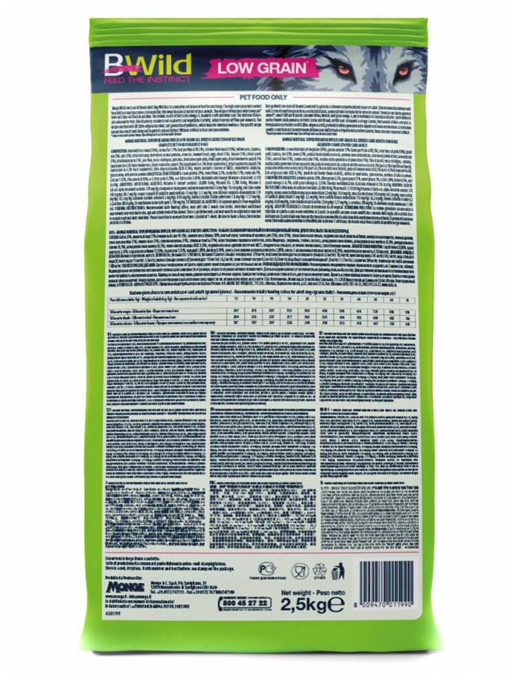 "Корм сухой Monge Dog BWild Low Grain, низкозерновой из мяса дикого кабана, для взрослых собак всех пород, 2,5 кг"
