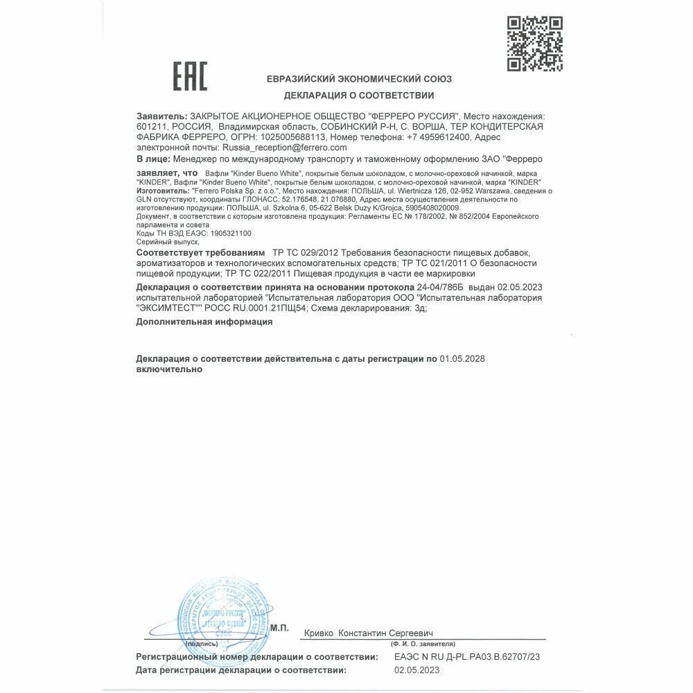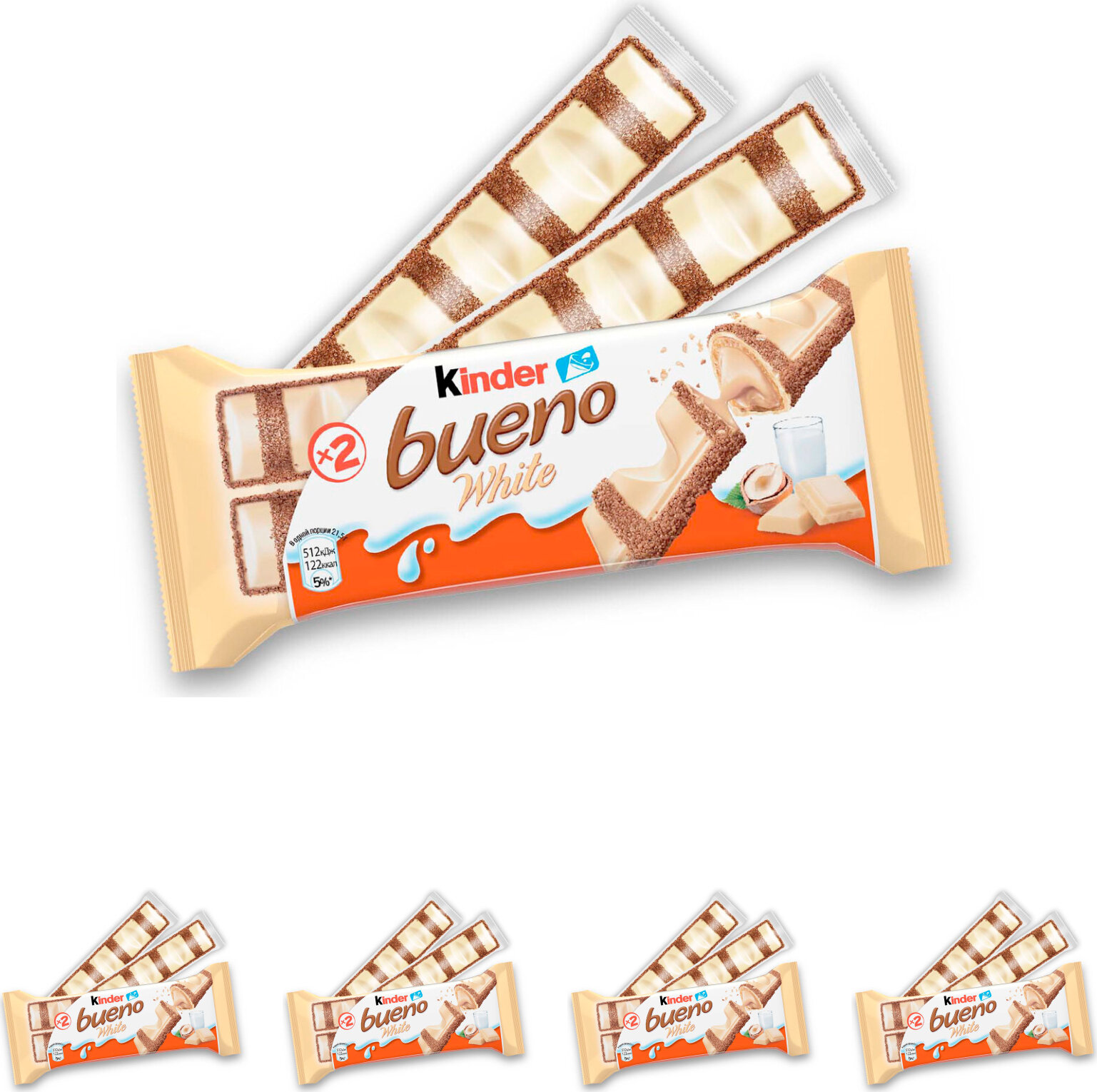 Вафли Kinder Bueno White, покрытые белым шоколадом, c молочно-ореховой начинкой