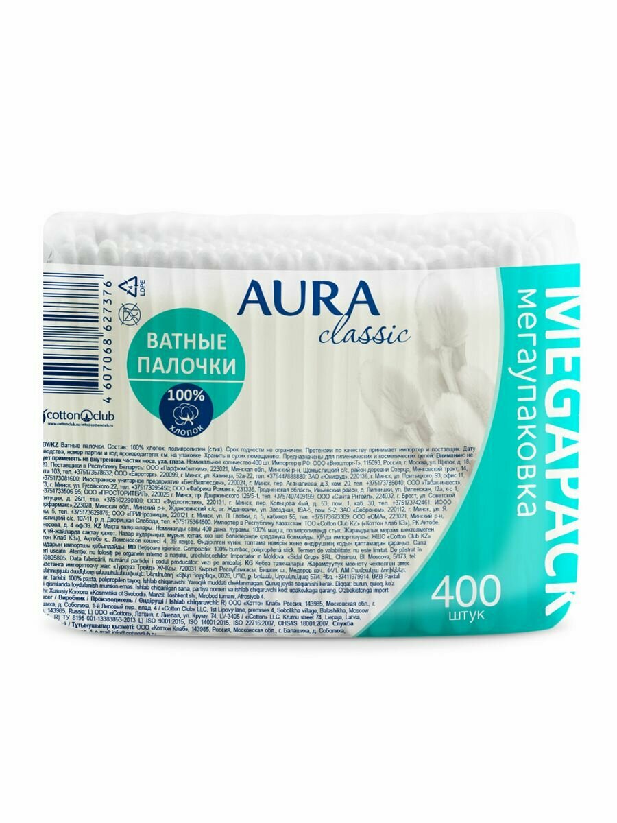 AURA Ватные палочки Classic п/э пакет 400 шт. автозапайка К