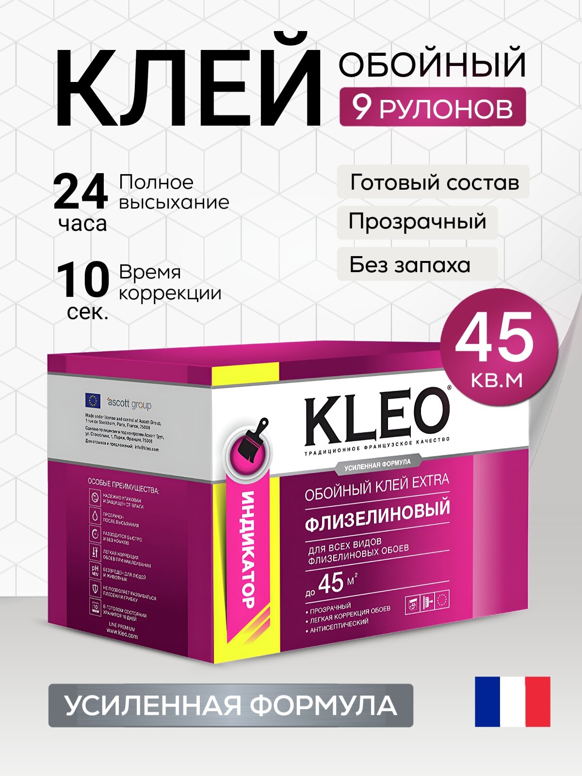 Клей для обоев KLEO EXTRA INDICATOR 45 усиленная формула с индикатором,обойный клей для виниловых, флизелиновых, бумажных, для обоев на основе малярного флизелина, антигрибковая и антисептическая формула Клео Экстра