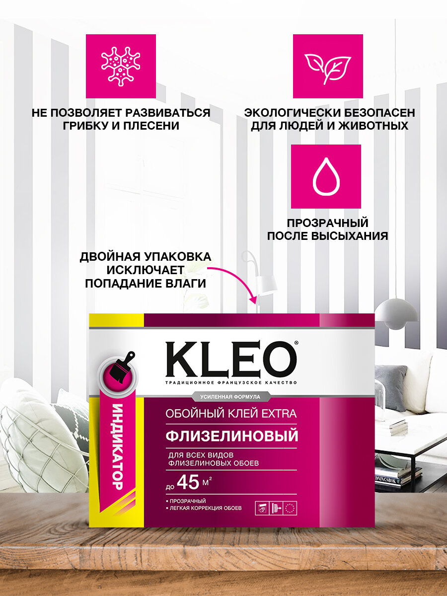 Клей для обоев KLEO EXTRA INDICATOR 45 усиленная формула с индикатором,обойный клей для виниловых, флизелиновых, бумажных, для обоев на основе малярного флизелина, антигрибковая и антисептическая формула Клео Экстра