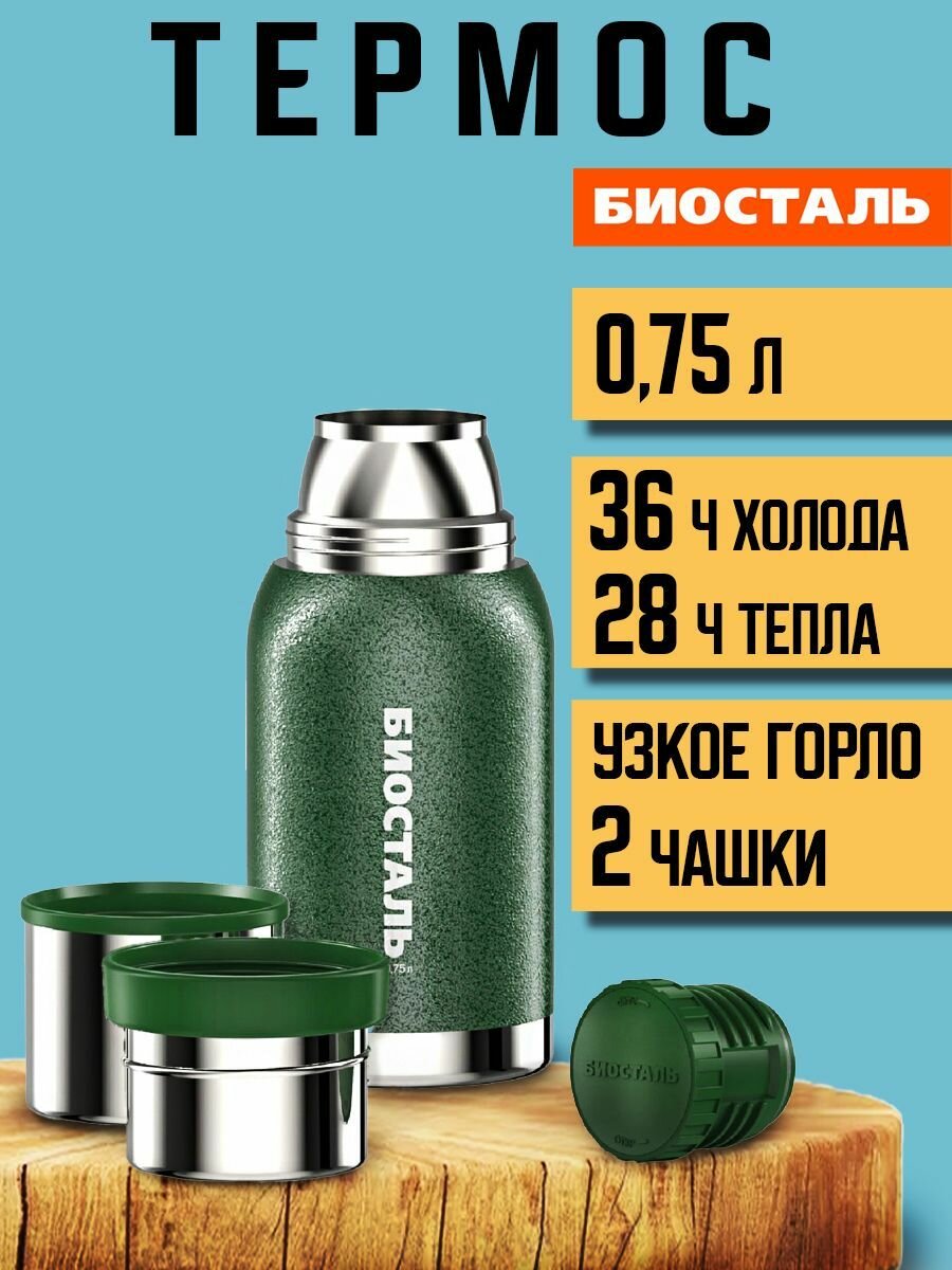 Термос Biostal Охота (0,75 литра), 2 чашки, зеленый Nba-750g .