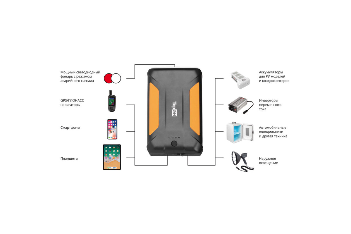 Заряжает отлично, можно сразу два или три устройства. Всё понравилось и цена и качество. Для меня очень удобно в пользовании аккумулятора TopON TOP-X38 , что есть авторозетка и фонарик. Единственное, как по мне, то немного тяжеловат 975 г.