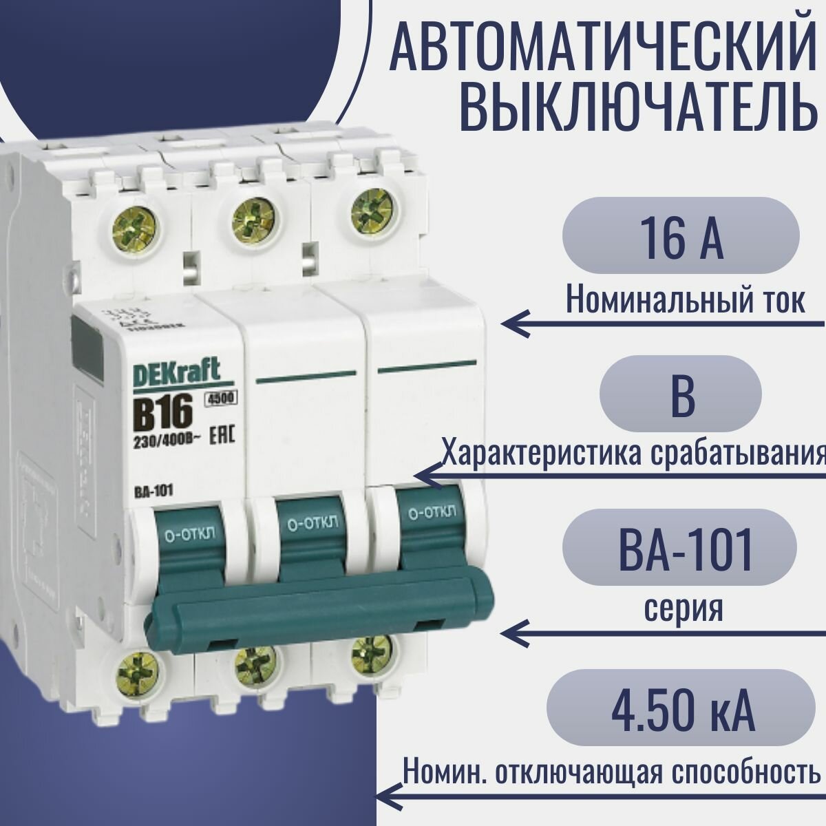 Автоматический выключатель трёхполюсный DEKraft ВА-101 16А, 4.5кА, характеристика B