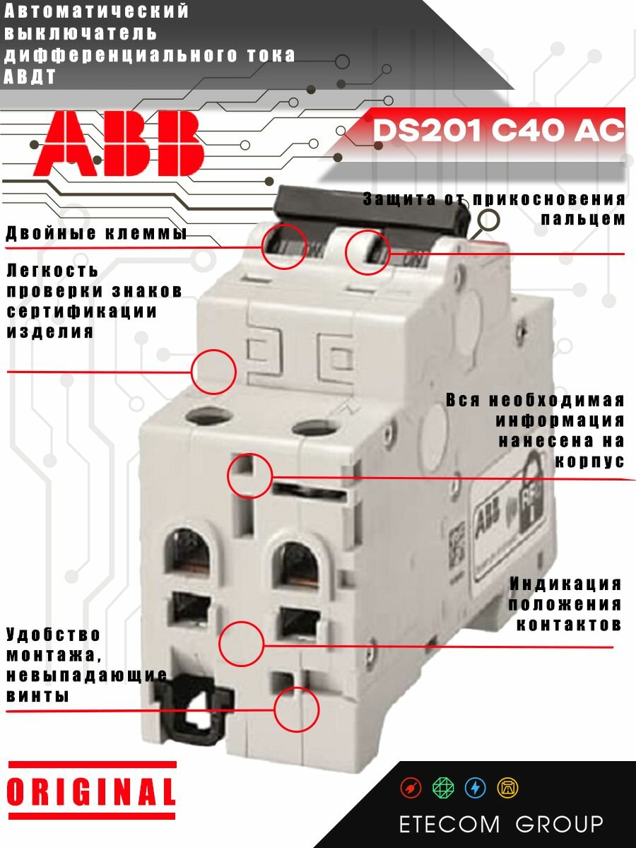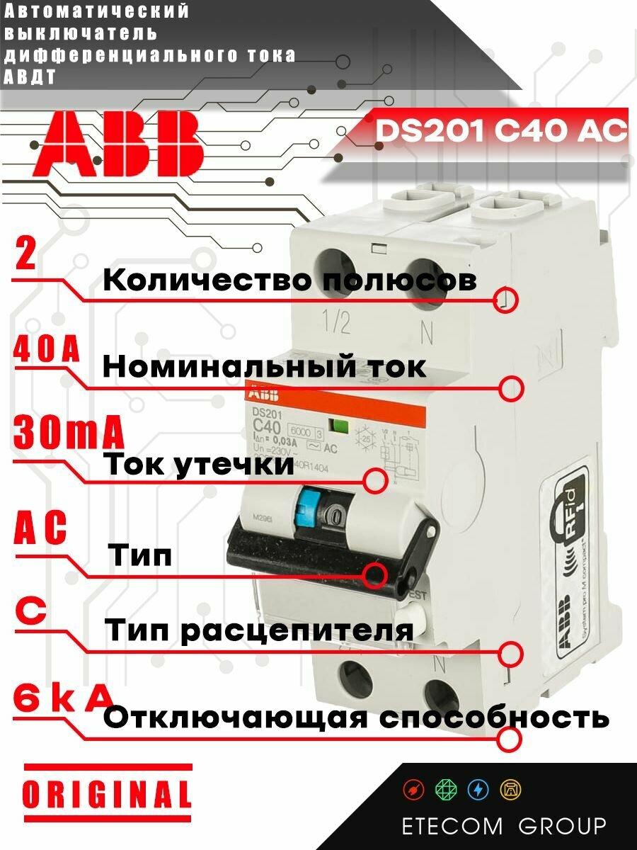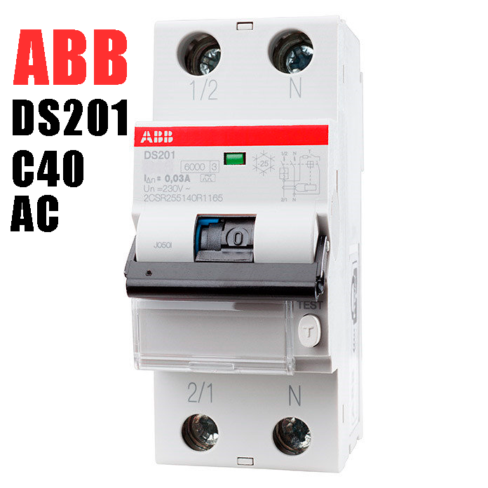Дифавтомат ABB DS201 C40 AC30 2-ПОЛЮСНЫЙ характеристика C 40A 30MA ТИП АС